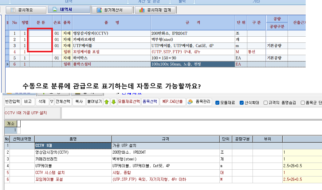물량을 내역으로 전송하면 자동으로 통합내역프로그램에 ´´분류´´ 칸에 ´´관급´´이 넣어지는 게 가능한가요?