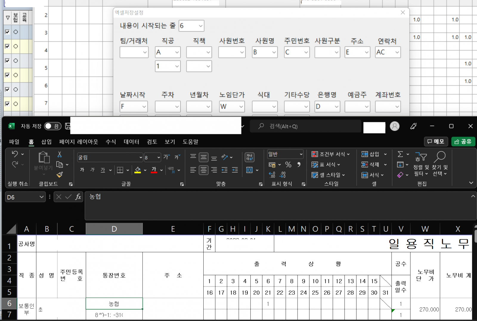 그런데 기존사용하던 노무비대장에 근로자 계좌은행명이가 D'6에 있고 계좌번호가 D.7으로 2열 양식사용중인데
