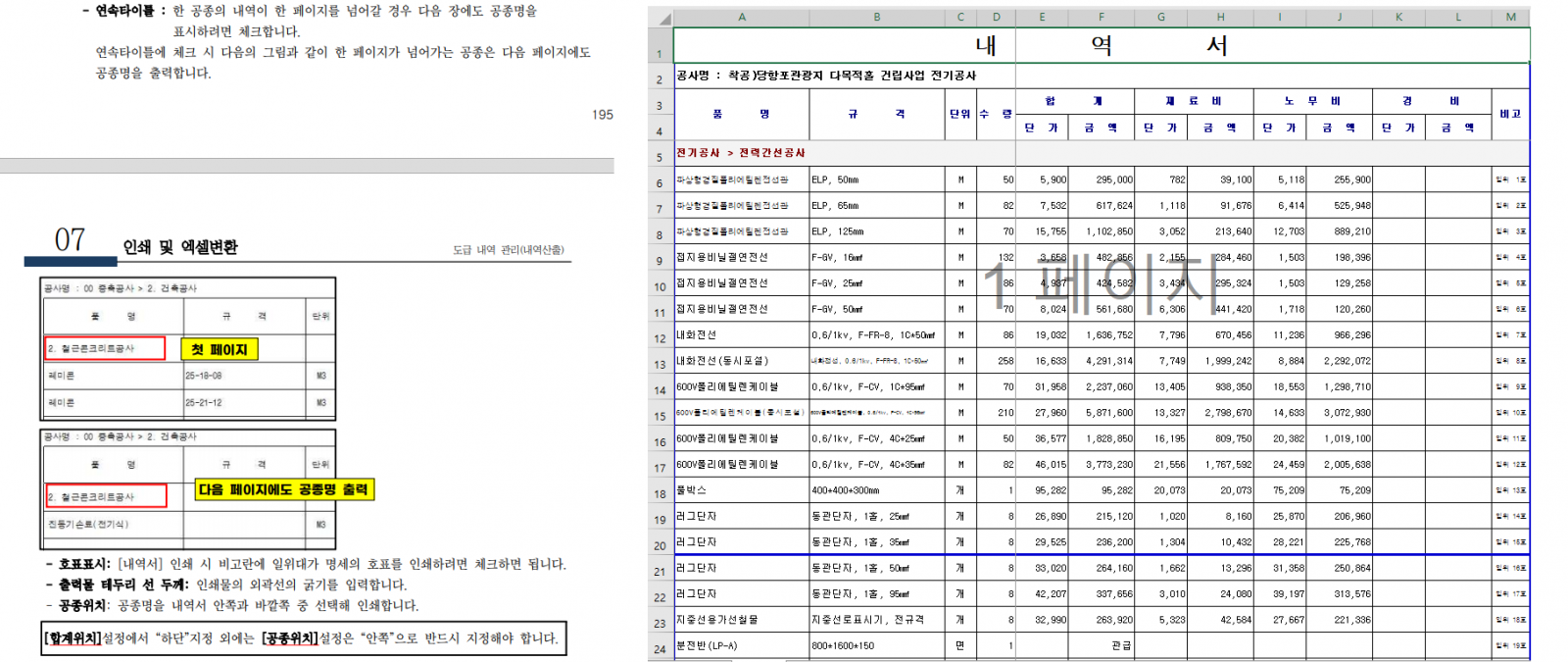 엑셀 변환하면 2page에 전력간선공사 공종명이 연속 타이틀로 표시되어야 하는 기능이 아닌가요?