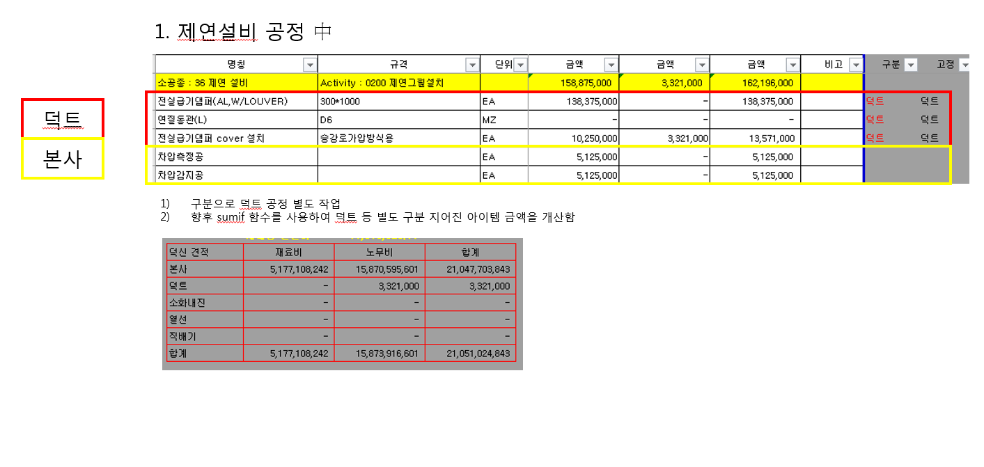 안녕하세요 덕신건업 하승호 대리입니다. 일전에 COSTS 관련하여 체험도중 한가지 부분을 해결 하면 제품구입을 진행 할 것 같아 연락드립니다. 현재 아성정보 COSTS 프로그램은 각 큰 공종으로만 구분 지어지고있는상황이지만 저희 업체에서는 저희 공사분과 외주공사분을 별도로 구분하여 금액을 따로 산정하고있습니다. 예를 든다면 [아파트 오배수배관공사] 라는 큰 공종안에 [PVC 파이프 공정과 ' 배기덕트 공정] 이 두가지 공정이 오배수배관공사안에 포함되어있을경우 두가지 공정을 구분하여 비율조정으로 금액을 잡고있는 상황입니다. 예시파일에 보시면 제연 설비라는 공종안에 전실급기댐퍼' 연질동관 전실급기댐퍼 cover 설치 는 덕트로 구분 차압측정공 ' 차압감지공 같은 경우 구분 짓지 않고 마지막에 덕트는 별도 취합. 구분되지않는것은 본사로 구분하여 금액 비율을 조정해 입찰하는 입장입니다. 혹시 이 기능이 costs에 추가로 해 주실수있는지 상담 드리며 혹여 이 사항으로 미팅을 진행 하거나 다른 추가 문의사항있으시면 070-4401-8087번으로 연락 부탁드리겠습니다 감사합니다
