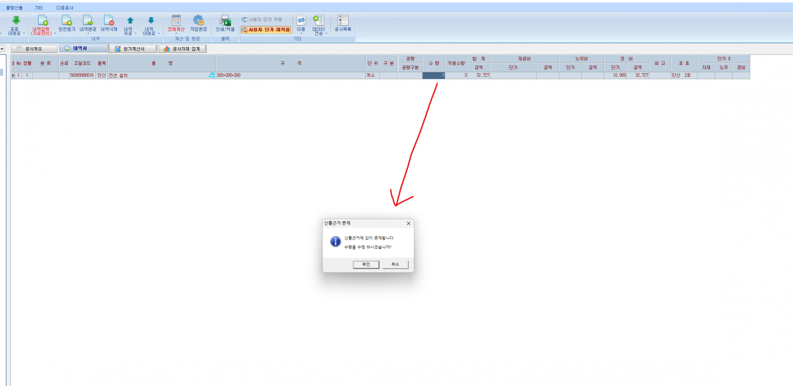 ´´산출근거에 값이 존재합니다. 수량을 수정하시겠습니까?´´ 라고 알림창이 뜹니다.