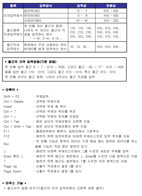 골조적산 _ 단축키 목록 > 골조/철골적산 | 아성정보㈜