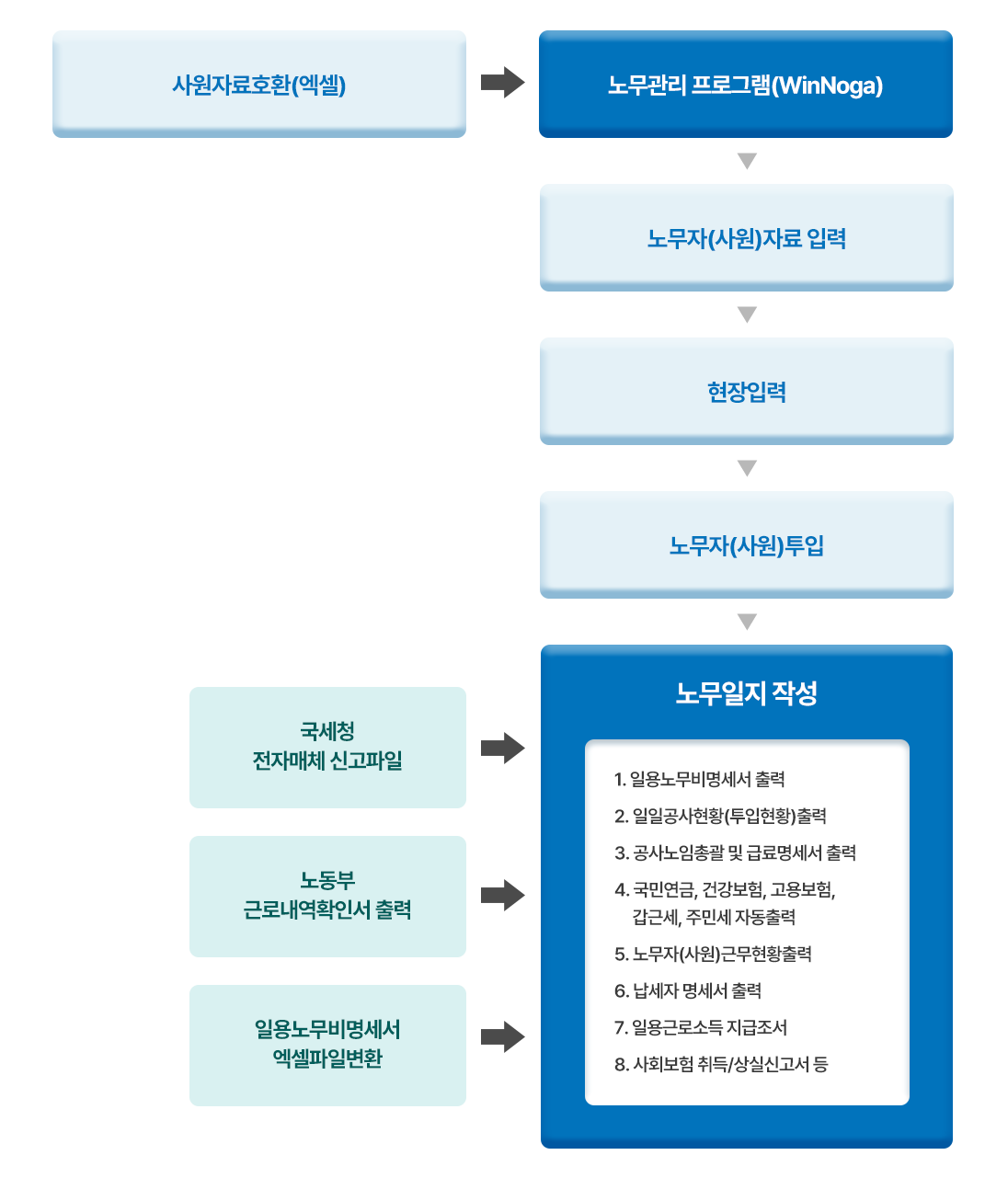 노무일지만 작성하면 소득세, 주민세, 각종보험료가 자동으로 계산되며 국민연금, 건강보험, 근로내역확인신고, 일용근로소득지급조서, 퇴직공제부금과 같이 전산매체파일 EDI로 신고 해야 하는 곳은 버튼 한번만 눌러주면 EDI파일로 생성되기 때문에 EDI로 바로 전송하면 됩니다.