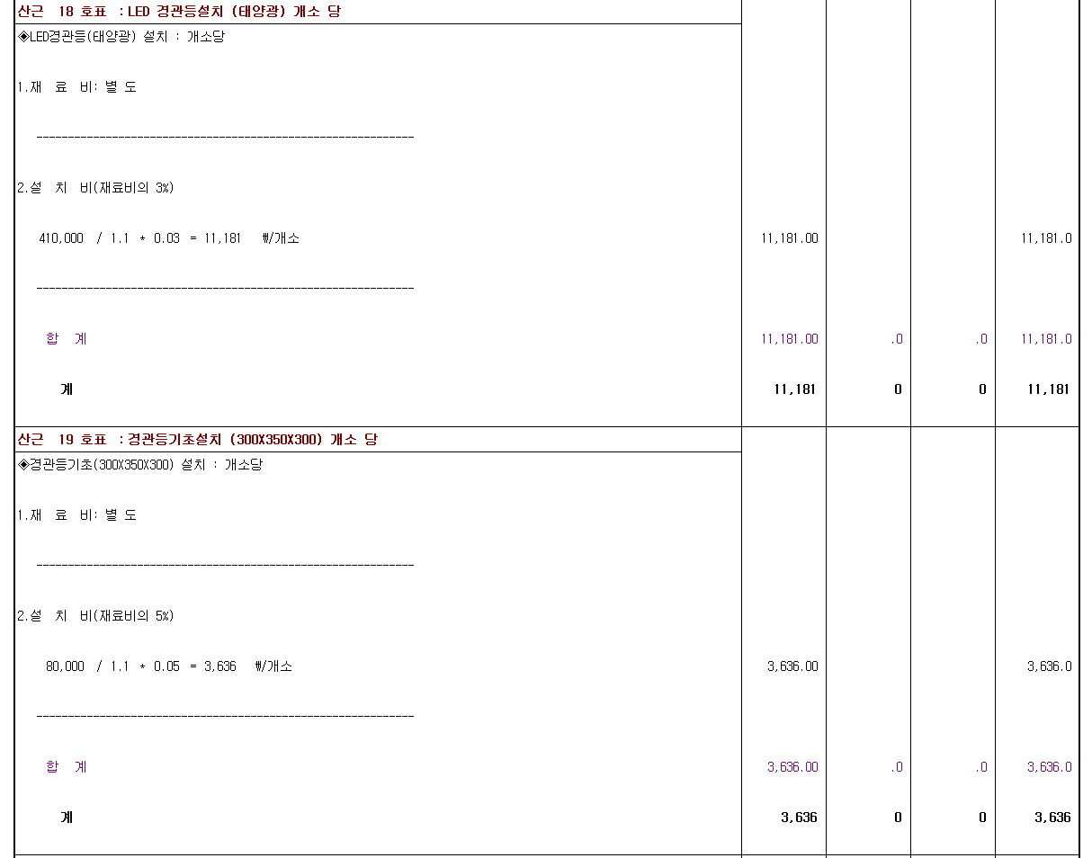 품목 앞에 분류를 별도계상이나 관급으로 적용하면 자재대가 빠져 버려서 설치비가 산출이 안되고..