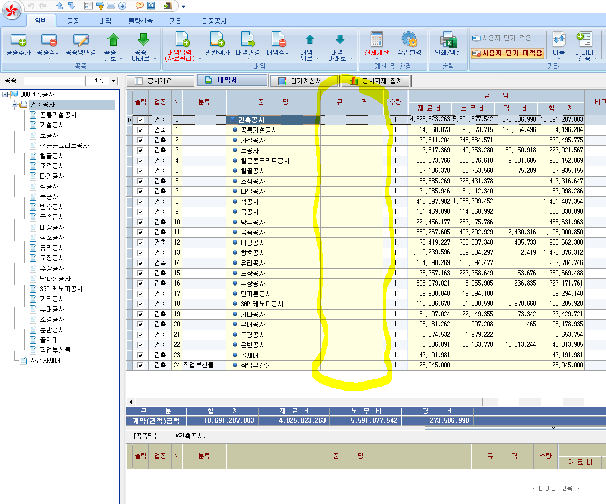 다만 불편한 것이 공종을 입력하고 규격란에 문자를 입력하고 싶은데'