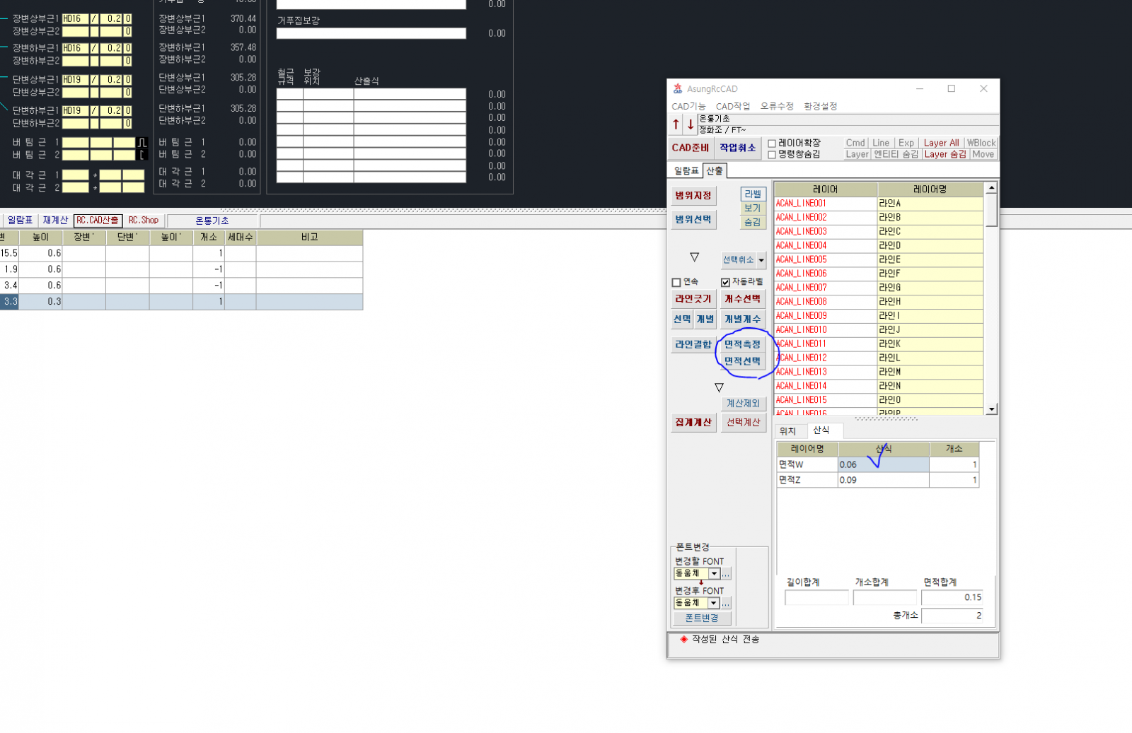 면적측정 버튼을 클릭 후 폴리선을 그으신다음 면적선택을 하시면 산식이 들어옵니다.