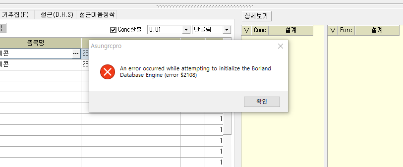 콘크리트 규격을 변경하려고 하는데 변경이 안되고 에러가 뜹니다.