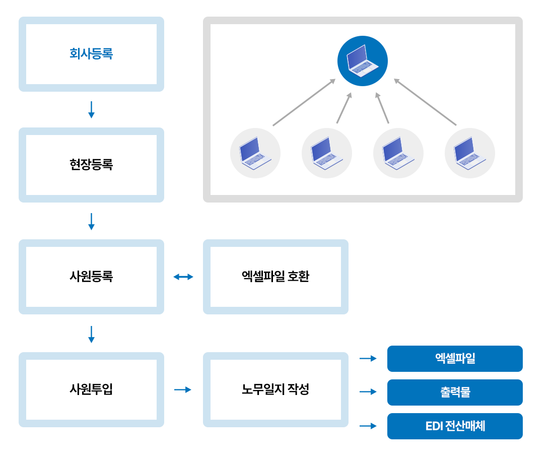 노무일지만 작성하면 소득세, 주민세, 각종보험료가 자동으로 계산되며 국민연금, 건강보험, 근로내역확인신고, 일용근로소득지급조서, 퇴직공제부금과 같이 전산매체파일 EDI로 신고 해야 하는 곳은 버튼 한번만 눌러주면 EDI파일로 생성되기 때문에 EDI로 바로 전송하면 됩니다.